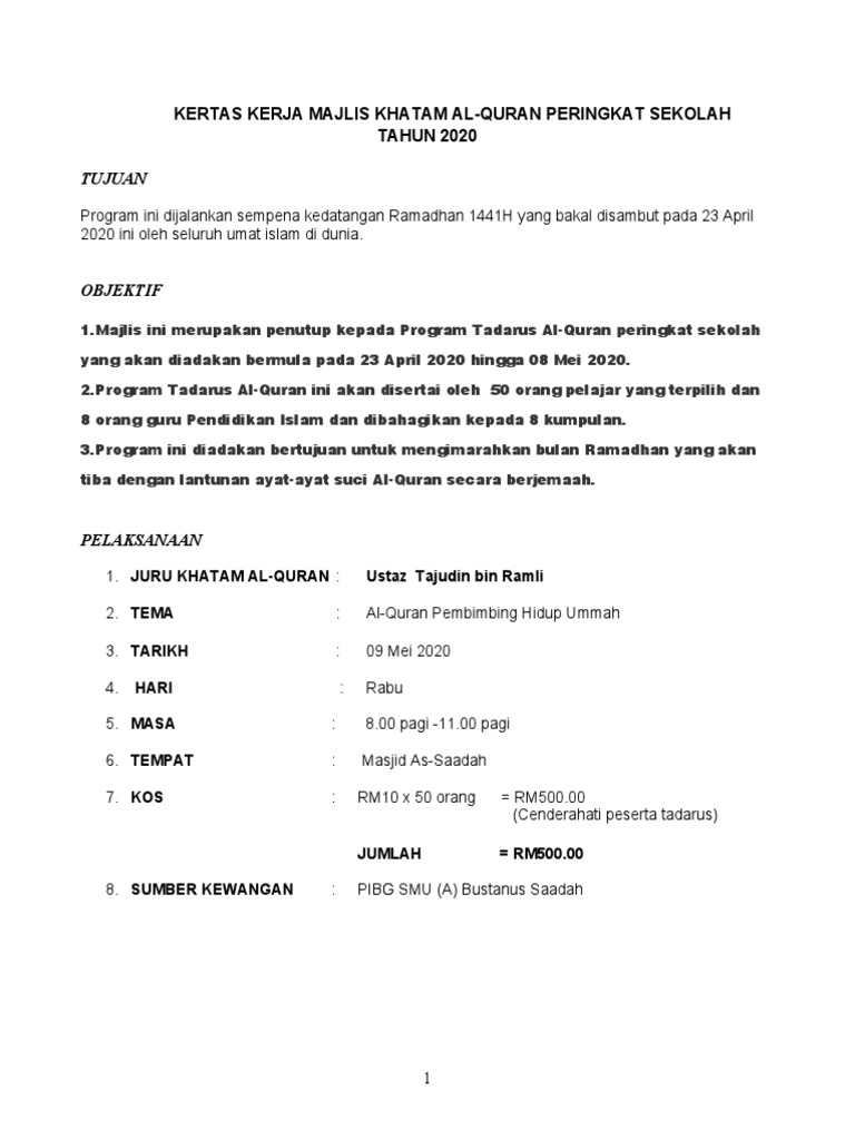 Kertas kerja majlis khatam al-quran dan berbuka puasa peringkat sekolah sekolah kebangsaan felda tenggaroh 4 felda tenggaroh 4 86810 mersing johor kelolaan panitia agama islam dengan kerjasama kelab guru tarikh. Kertas Kerja Majlis Tadarus Al-Quran Peringkat Sekolah Muka Surat 1. Contoh surat jemputan majlis khatam al quran via neodv8 contoh kertas kerja kelas alquran mosik explicit through mosikexpressblogspot contoh.